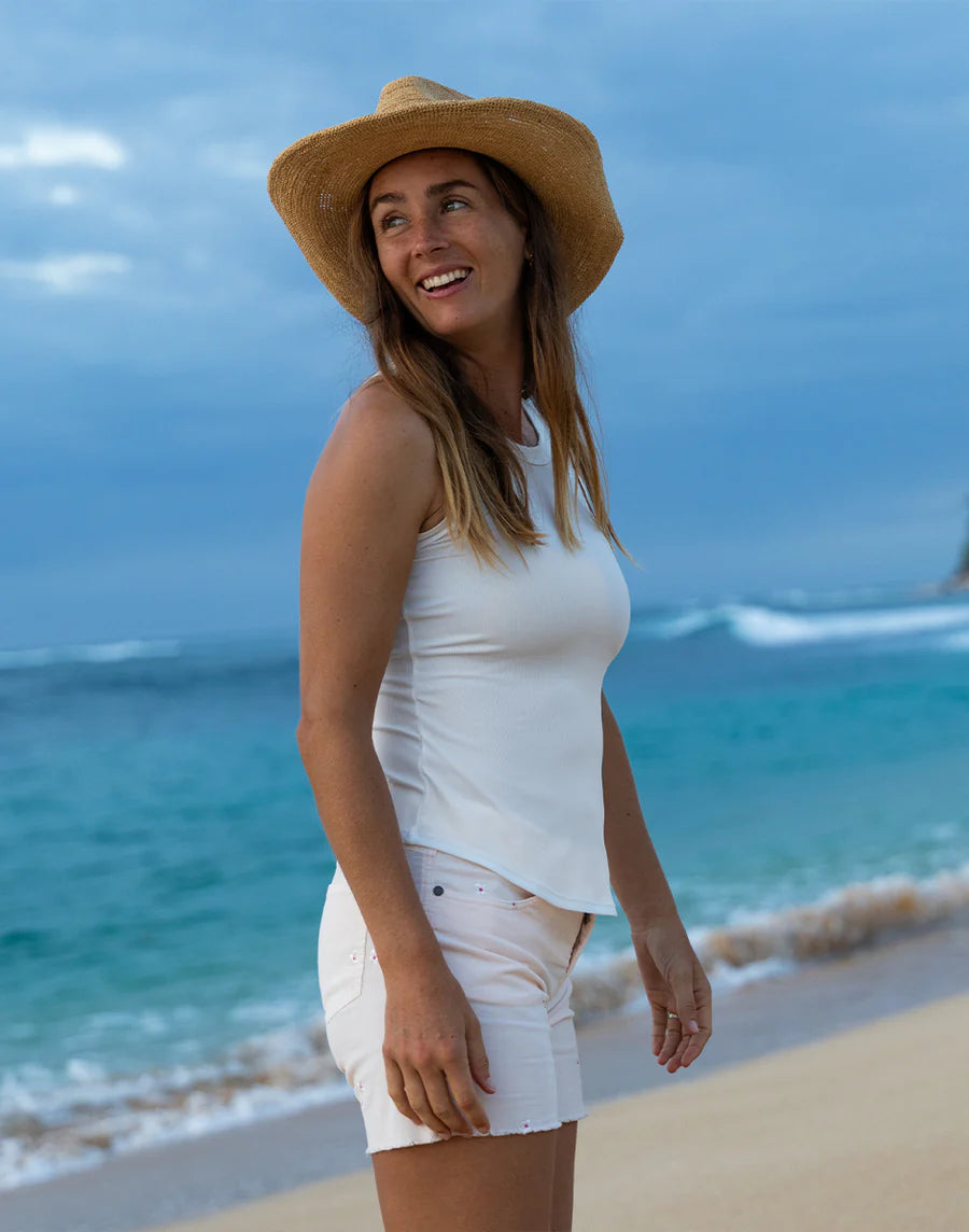 The Lyra Tank is built to move from surf checks to sweat sessions and everything in between. Crafted from a lustrous high performance rib fabric it delivers a smooth elevated sheen with the stretch and support you want in a true workout tank. The fitted silhouette high neckline and racerback design stay put through movement while the 2x2 rib adds subtle texture and a flattering hold. Finished with robust 50+ UPF Lyra is a standout from our Surf to Sweat Collection made to work hard wear beautifully and keep up with whatever the day throws your way.
