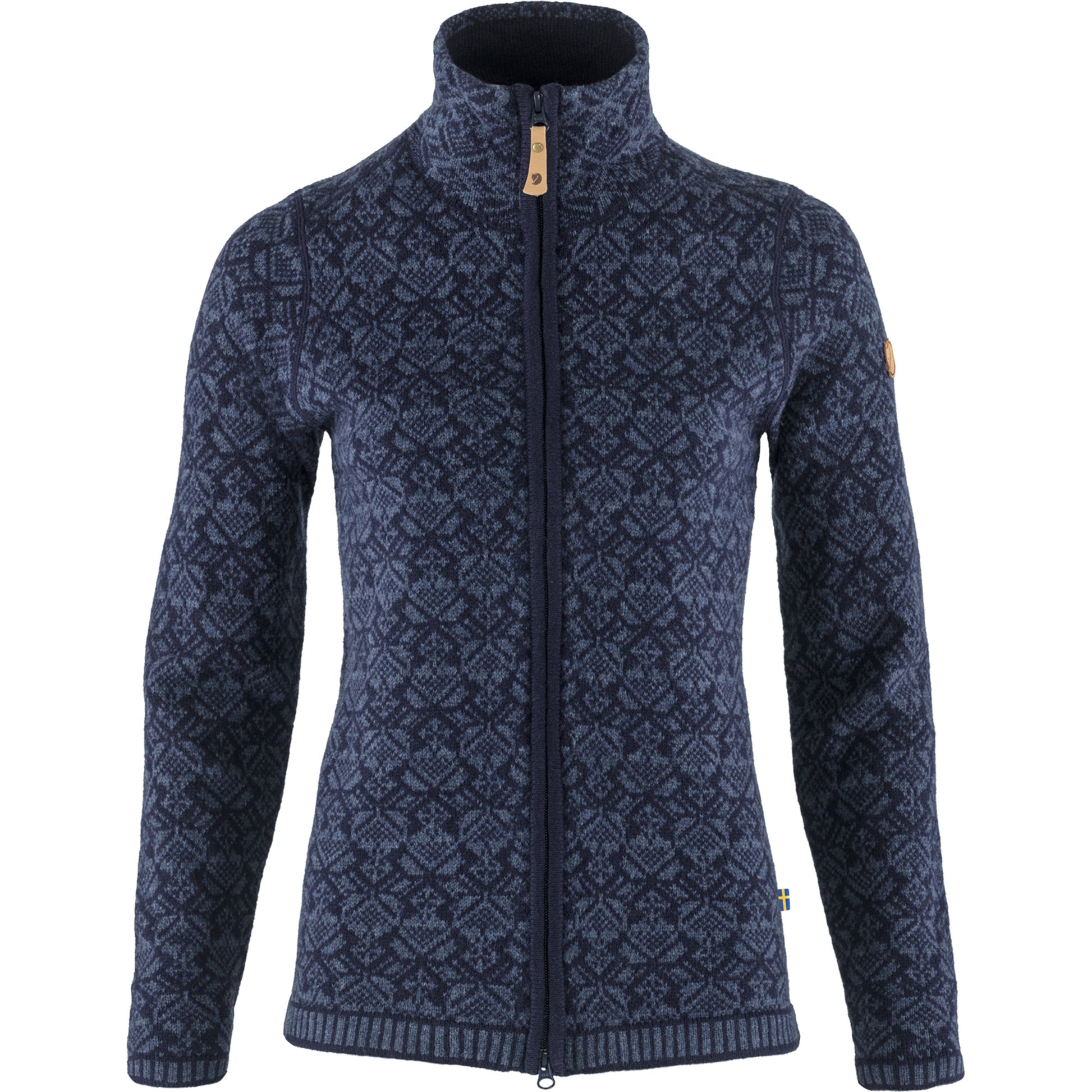 Beautiful jacquard-knitted cardigan in soft, warm lambswool. Two-way zipper at the front and a high straight collar to keep the neck warm. A classic model that is just as suitable for winter walks as it is for everyday use. 100% lambswool. Pattern inspired by Scandinavian folklore. Two-way zipper. Little leather logo on the sleeve.